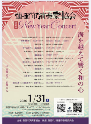 蓮田市近郊出身、在住の演奏家による新年を祝う華々しいコンサート。声楽、ピアノ、筝、弦楽器、打楽器による演奏。アンサンブル。