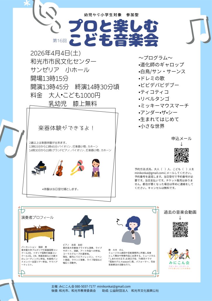 | 備考 | 助成:公益財団法人和光市文化振興公社 後援:和光市・和光市教育委員会 詳細:みにこん会のブログ https://ameblo.jp/minikonkai/ |