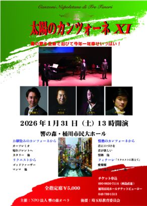 3名の声質の違ったテノール(榛葉樹人、上本訓久、西島定一)で甘く、情熱的な、哀愁を込めたカンツォーネのコンサート。オーソレミオ、帰れソレントへ、カタリなど。