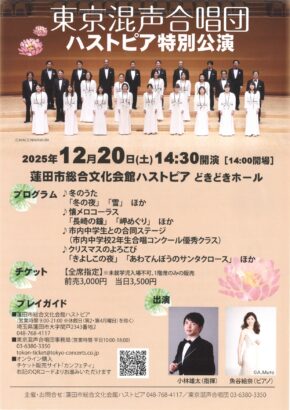 毎年大好評の東京混声合唱団ハストピア公演も、今年で4年目。東京混声合唱団は1956年3月に創設された日本を代表するプロフェッショナル合唱団の素晴らしい歌声を、ぜひハストピアどきどきホールでお楽しみください。