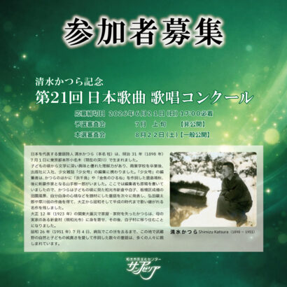 | 関連URL | https://www.sunazalea.or.jp/event/20260822-%e6%b8%85%e6%b0%b4%e3%81%8b%e3%81%a4%e3%82%89%e8%a8%98%e5%bf%b5-%e7%ac%ac21%e5%9b%9e-%e6%97%a5%e6%9c%ac%e6%ad%8c%e6%9b%b2-%e6%ad%8c%e5%94%b1%e3%82%b3%e3%83%b3%e3%82%af%e3%83%bc%e3%83%ab/ |