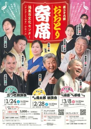 | 備考 | ●3回セット券 https://clea-konosu.com/event/20260124-0308/ ①三つ巴競演会 https://clea-konosu.com/event/event-20260124/ ②柳家喬太郎 独演会 https://clea-konosu.com/event/event-20260228/ ③入船亭扇遊・春風亭柳橋 二人会 https://clea-konosu.com/event/event-20260308/ |