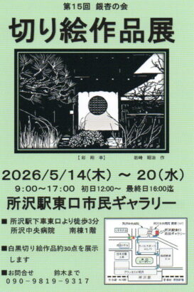 第15回銀杏の会切り絵作品展 開催地所沢市 「銀杏の会」は、所沢市の公民館を活動拠点として、白黒切り絵の美を追求し、研鑽に励んでいる切り絵サークルです。 今回の作品展は、白黒切り絵を約30点展示します。 開催日 2026年05月14日(木)~2026年05月20日(水) 開催場所 所沢駅東口市民ギャラリー 最寄駅等 西武線所沢駅下車東口より徒歩3分 料金 無料 主催者 銀杏の会 問い合わせ先 鈴木まで 090-9819-9317 備考 開催時間は、初日は12時から、最終日は16時まで * この情報は、主催者から提供されたものです。実際に参加される場合には、内容を事前にご確認ください。