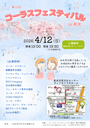 | 問い合わせ先 | コーラスフェスティバルin和光実行委員会 090-6502-8937(熊澤) サンアゼリア 048-468-7771 |