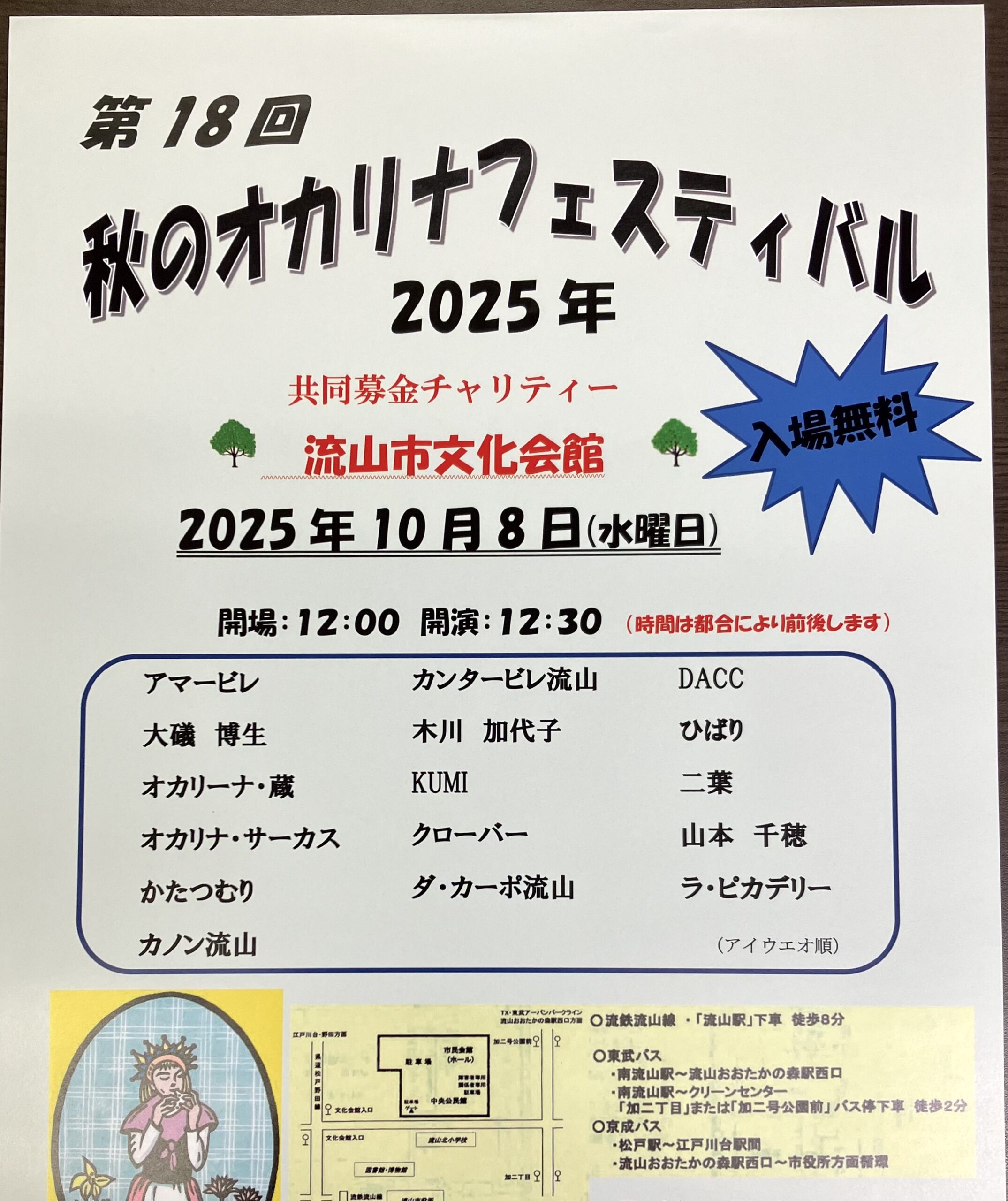 流山で恒例の 第18回 秋のオカリナフェスティバル を文化会館で開催します