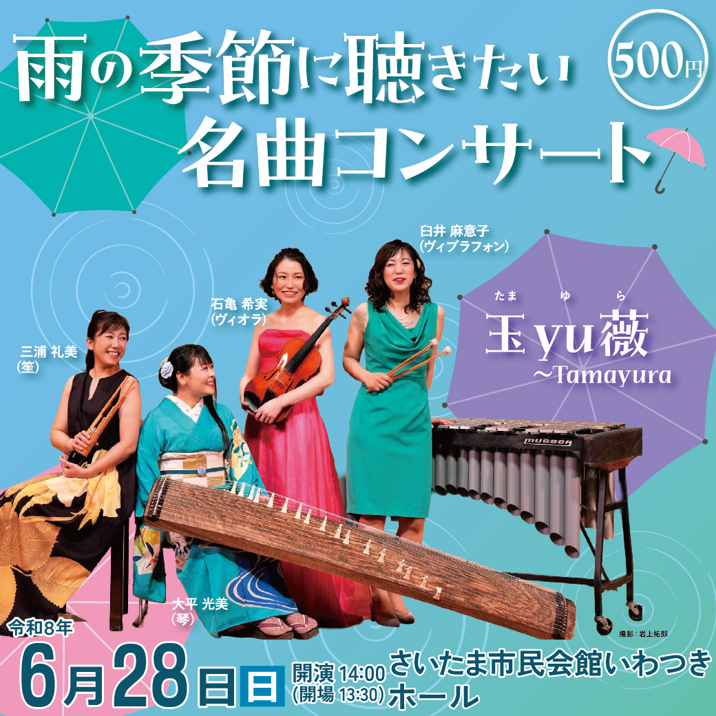 そんな雨の多い季節に音楽で心の安らぎや明日への活力を届けるべく、市民会館いわつきでは「雨の季節に聴きたい名曲コンサート」と題し、雨にちなんだ楽曲を特集したコンサートを企画いたしました。