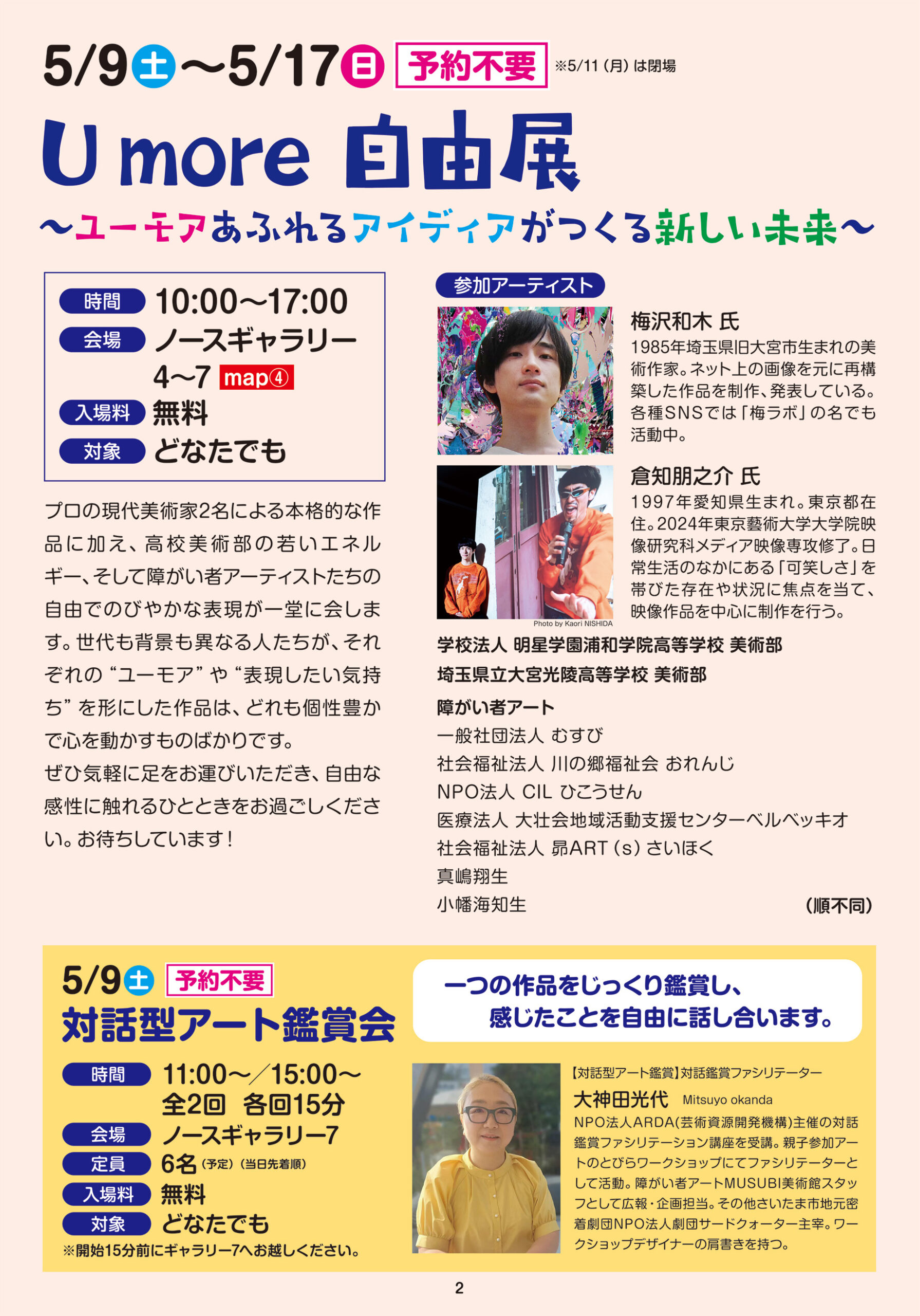プロの現代美術家(梅沢和木氏・倉知朋之介氏)の本格的な作品に加え、高校美術部、障がい者アーティストたちの自由でのびやかな表現が一堂に会す。世代も背景も異なる人たちが、それぞれの“ユーモア”や“表現したい気持ち”を形にした作品は、どれも個性豊かで心を動かすものばかり。気軽に足を運んで自由な感性に触れるひとときを過ごそう!
